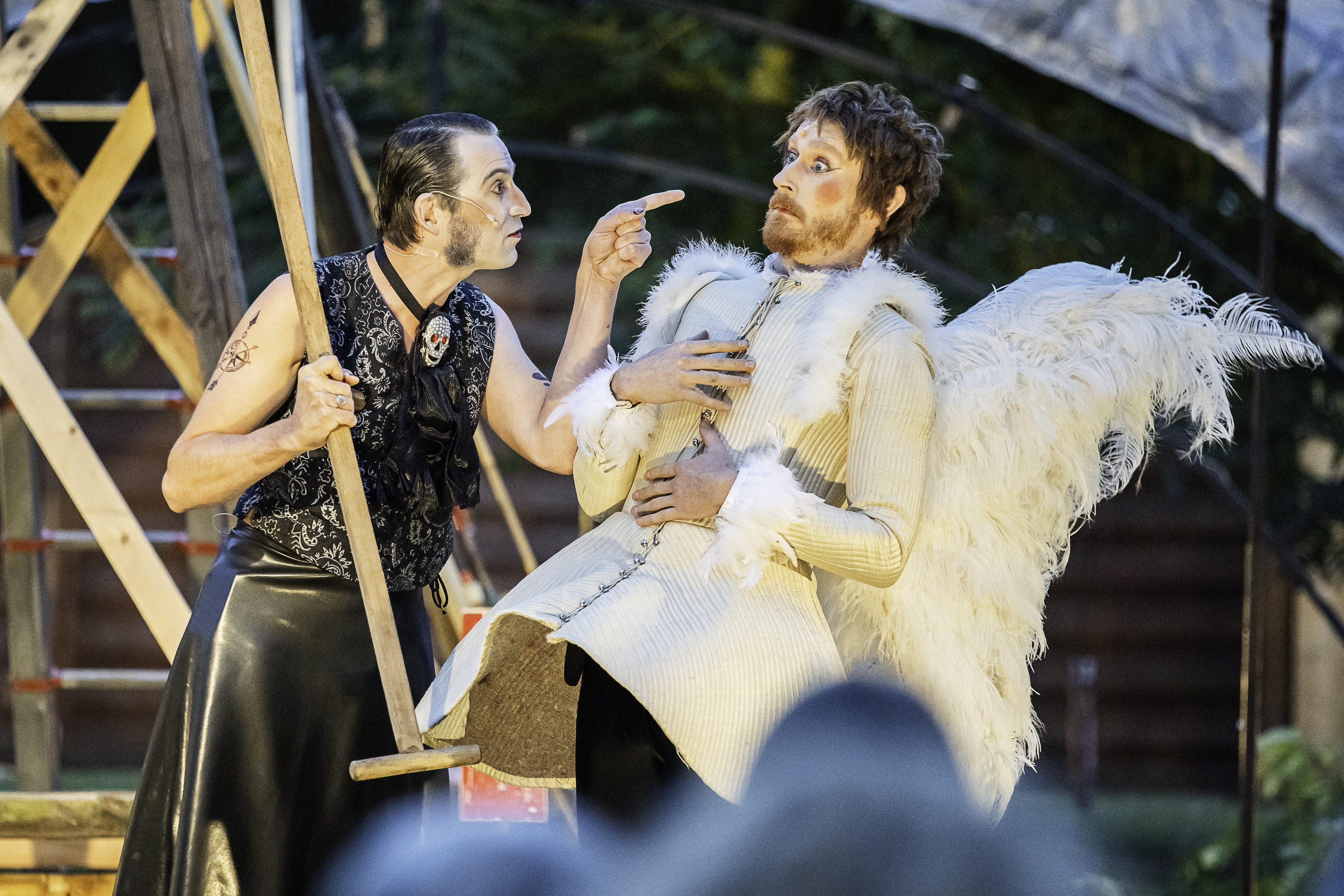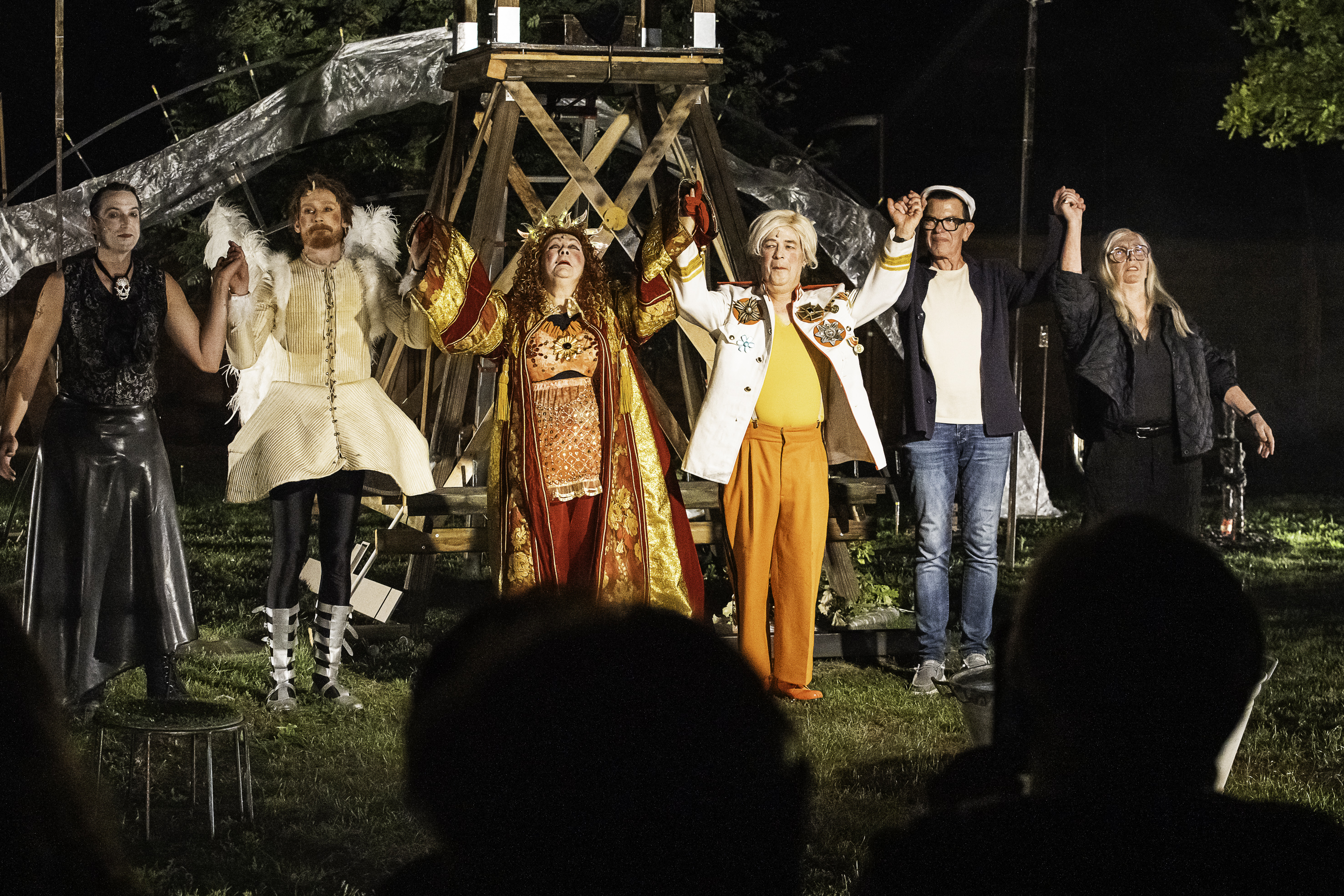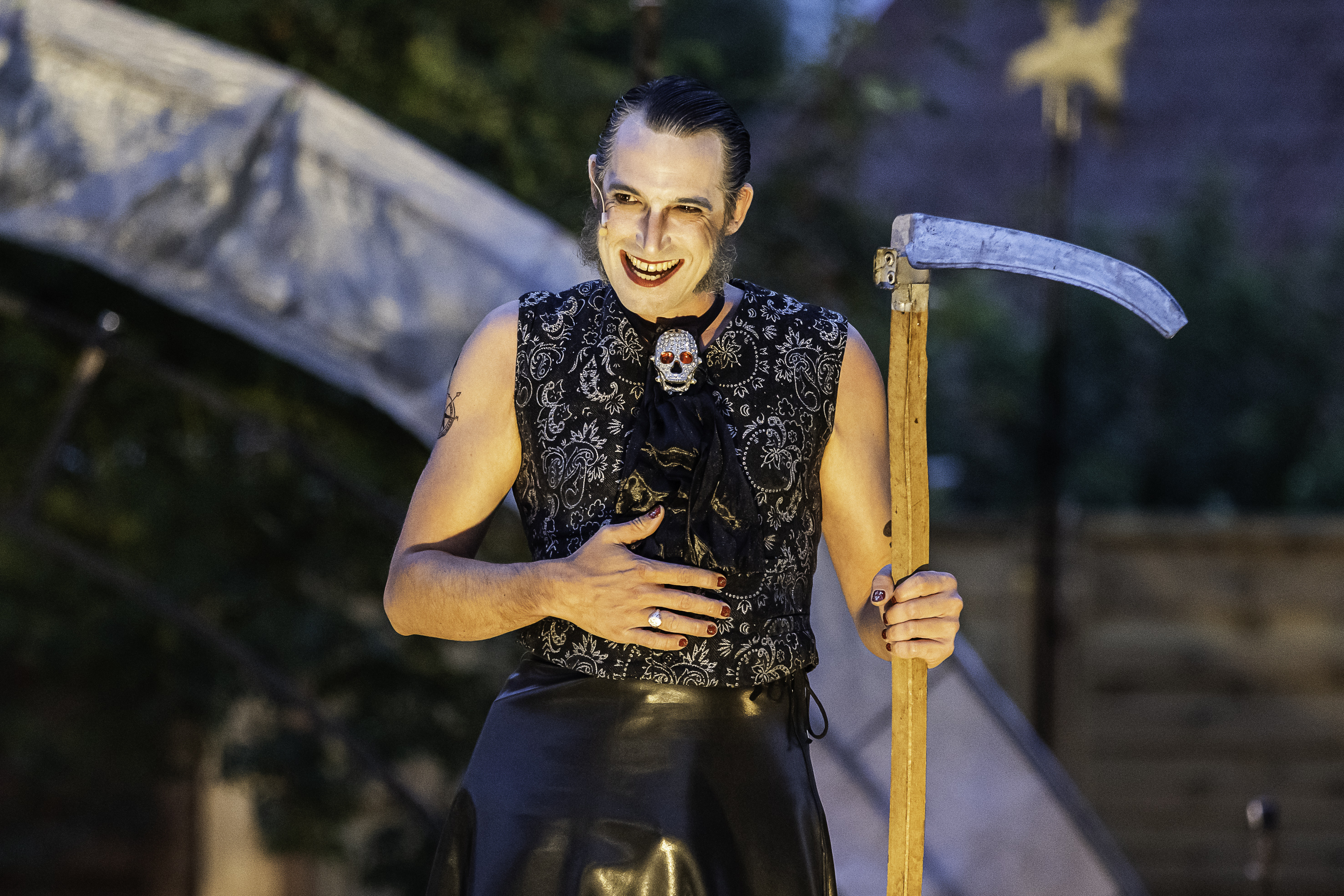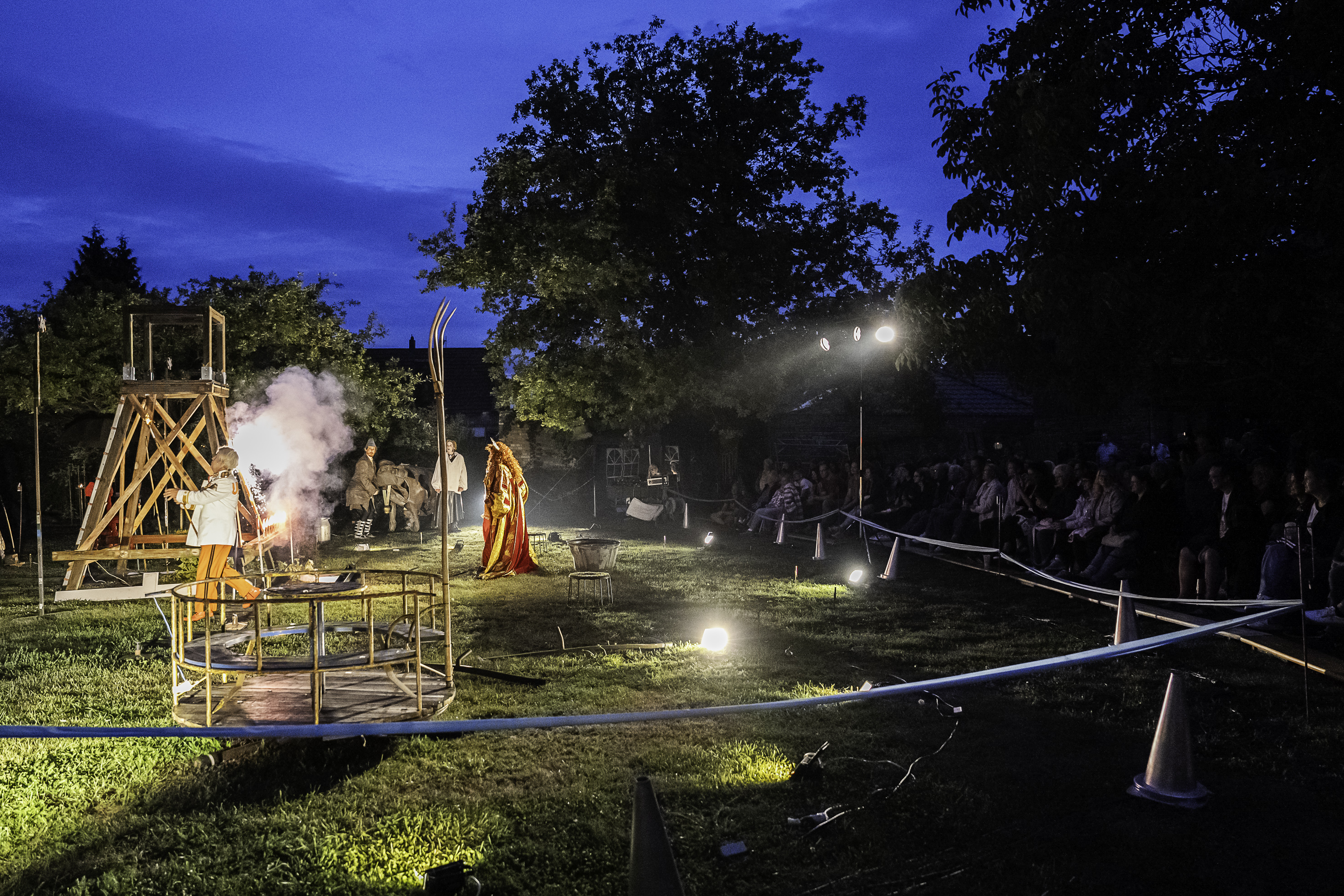 Im Schatten des Turms der niedergebrannten Wigbertkirche, eine der WirkungsstäHen Thomas Müntzers, befindet sich die historische Stadtmühle aus dem 17. Jahrhundert. Ihr stimmungsvoller Garten wird zur Bühne für vier Schauspieler und Feuerwerks-Künstler, die eine sehr spezielle, komödiantische Show zum geschichtlichen Gedenken darbringen, indem sie sich nicht nur als Protagonisten der Zeit des Bauernkriegs, sondern auch als Diskutanten höherer Sphären zur Verfügung stellen: Wir erleben einen tatsächlich beflügelten Engel Michael, der an der Seite des pragmatisch selbstgerechten Todes versucht, uns zu bewegen, alle schwerwiegenden Hoffnungen aufzugeben, um, wie damals zu Müntzers und Luthers Zeiten, die immer aktuelle Frage, wessen Geistes Kind die Menschheit zu werden gedenkt, klug zu beantworten. Und das angesichts eingreifender Erfindungen: zwischen Buchdruck, Banken und jenen, die bis weit in den Kosmos reichen. Wir erleben aber auch eine durchaus bezaubernde, selbstreferenMelle Abendsonne in charmant aufgebügeltem Theater-Kostüm, die in purer Lust überall zündelt, um schließlich selbst in heiße Liebe zu einem neuentdeckten Planeten UB313 zu entbrennen, der dann, der Feuer-Kunst mächtig, für uns alle die ungewöhnlichsten Ausdrucksformen dieser Kunst - von zart-lieblich, bis zu aggressiv- gefährlich - nicht nur prachtvoll darzubieten, sondern auch hochschweifend-üppig zu platzieren weiß!